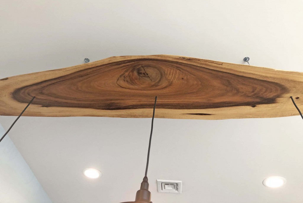 Monkeypod wood is an exotic hardwood found mainly in tropical climates. It tends to be a golden color, and some varieties also beautiful streaks of reds and browns. This light fixture was built for a newly constructed dental office in their reception area. The fixture is almost 6 feet wide and 8-12 inches wide. The wood slab was sanded down to a 600 grit and finished with an oil-wax finish. The light fixtures give it an industrial modern look and have Edison style light bulbs in it. These types of light fixtures are perfect for a dining area, over the kitchen island or in a foyer.
