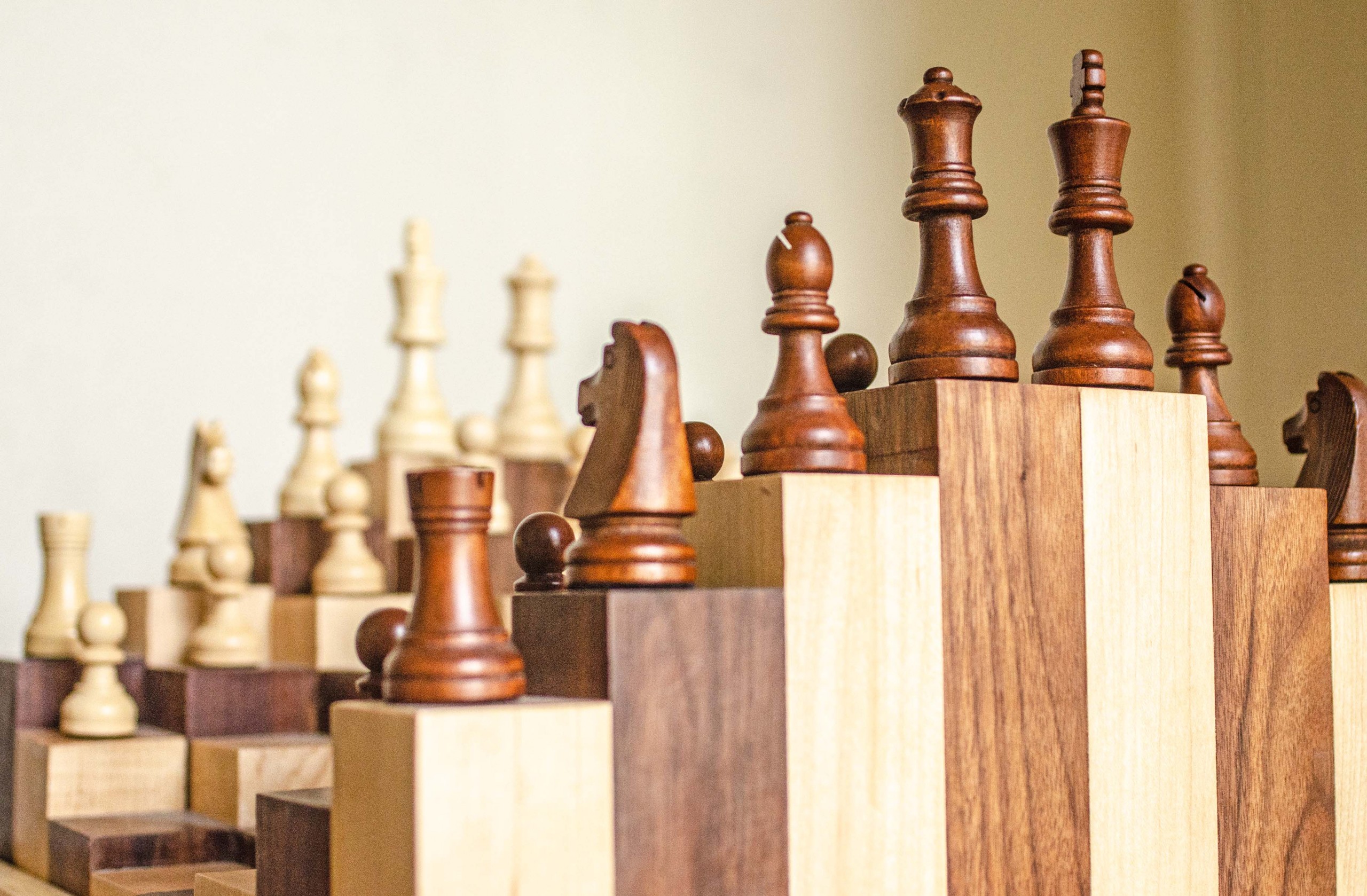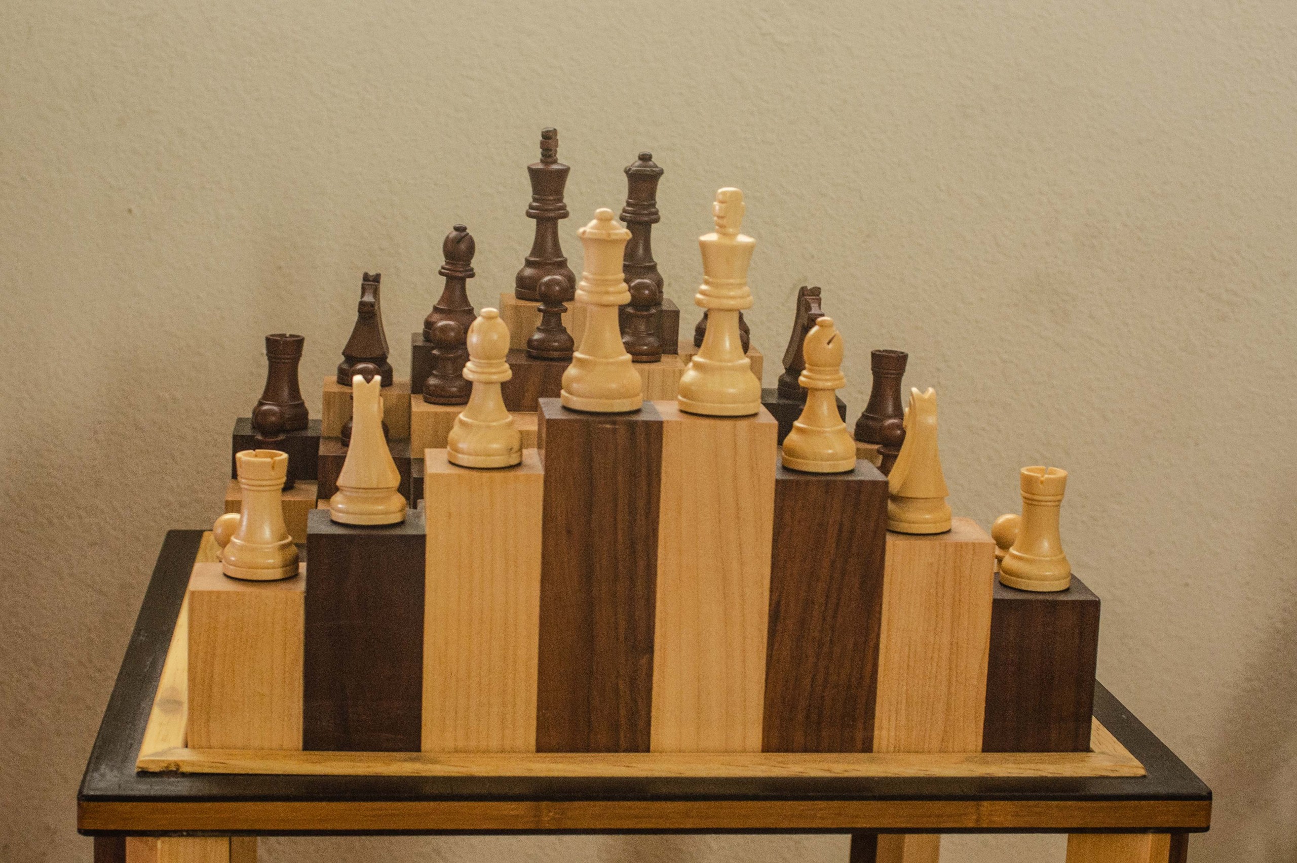 One of our best projects. This was a labor of love, love for the game of chess and love to create a piece of art honoring the game. I got inspired in a discussion with a retired ISRO scientist (Indian Space Research Organisation) I met at a Wine and Art festival, who ended up loving my wood work display and started talking about chess and the art of war in valleys and mountains. How would an army fight in a hilly region ? That gave me a spark of inspiration to create a multi level 3D chess board. Each piece sitting at a different level.